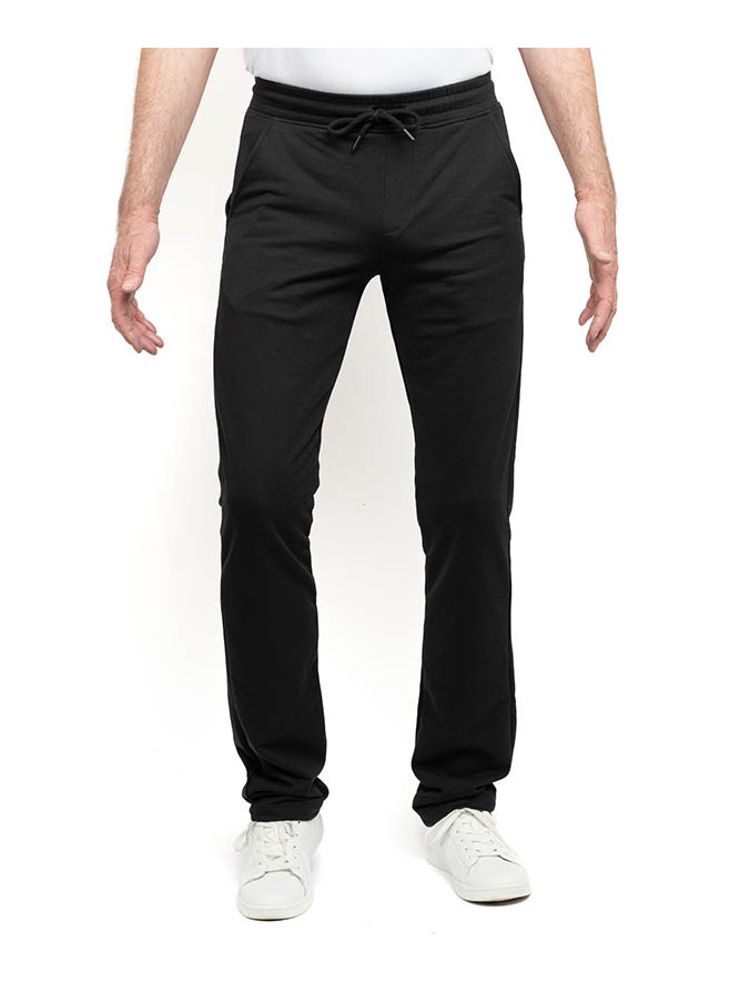 Jogging pants with adjustable elasticated waistband with drawstring. 2 side pockets. 1 back pocket. Straight hem.