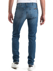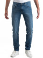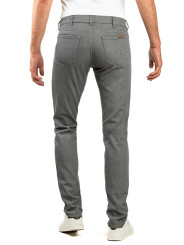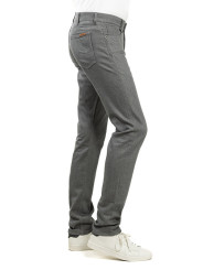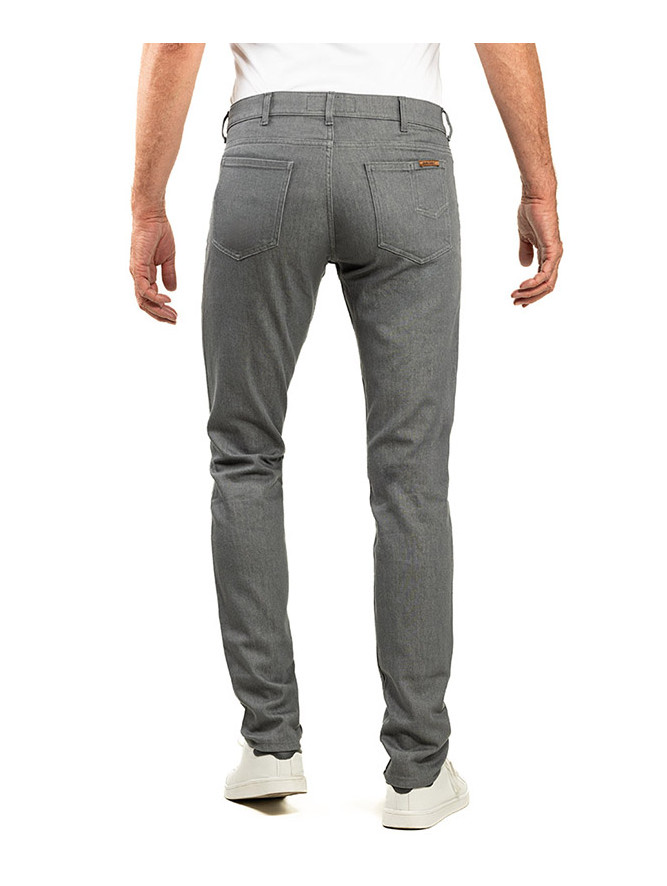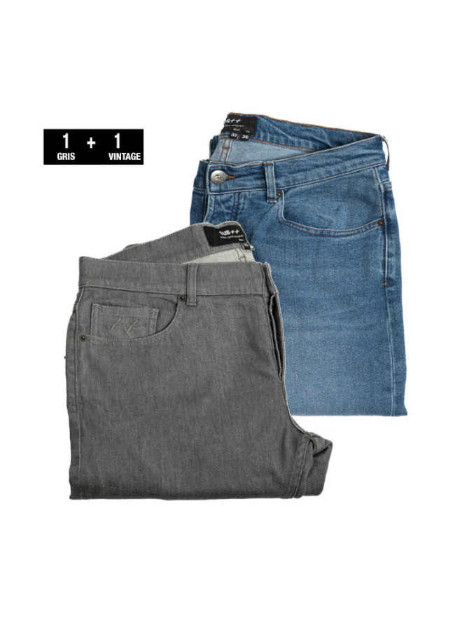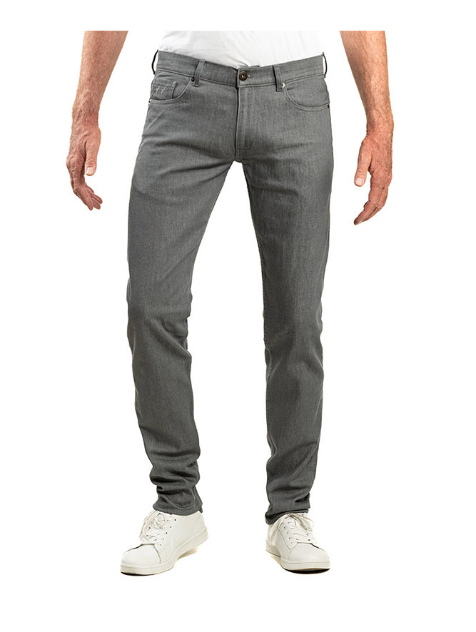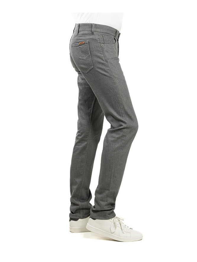 Modèle 1 : Alex grey metal : Jean, 5 poches, fil de piquage ton sur ton (effet pantalon). Braguette Zip autoblocant. Rivets de renfort aux angles de poches. 2 poches dos plaquées plus une 6eme poche signature.