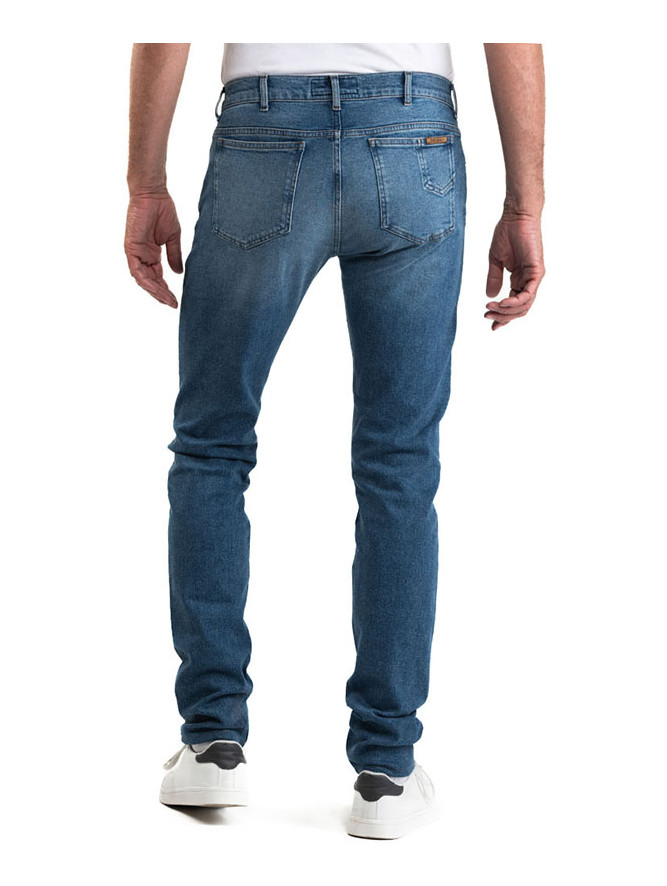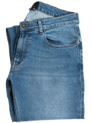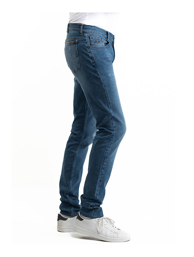 Jean, 5 poches, fil de piquage couleur tabac (traditionnel). Braguette Zip autoblocant. Rivets de renfort aux angles de poches.