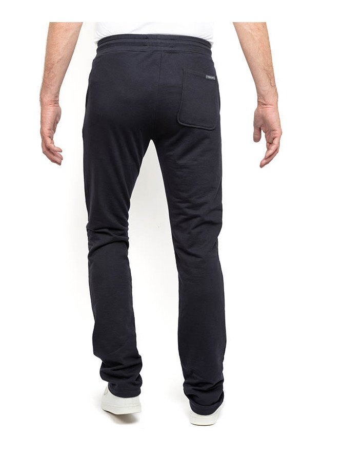 Jogging avec ceinture élastiquée ajustable par cordon. 2 poches coté. 1 poche dos. Bas de jambe droit.