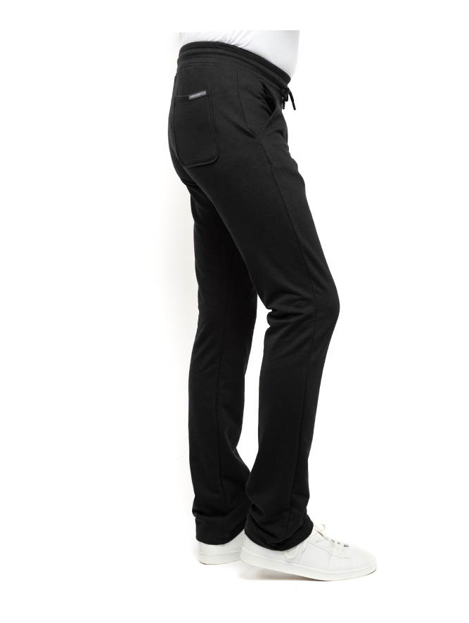 Jogging avec ceinture élastiquée ajustable par cordon. 2 poches coté. 1 poche dos. Bas de jambe droit.