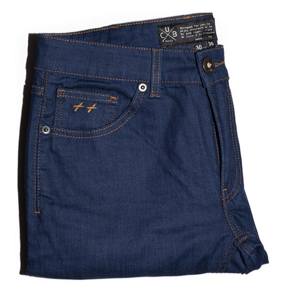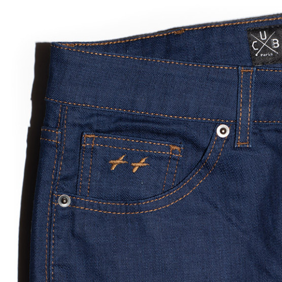 Jeans, 5 poches, couture fil tabac (traditionnelle). Braguette zippée autobloquante. Rivets de renfort aux coins des poches. 2 poches arrière plaquées et une 6ème poche signature. Coupe : Coupe ajustée (près de la jambe et ourlet resserré). Mesures conformes aux tailles standards CUB....