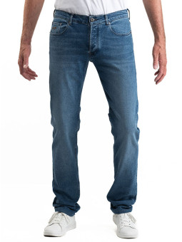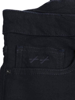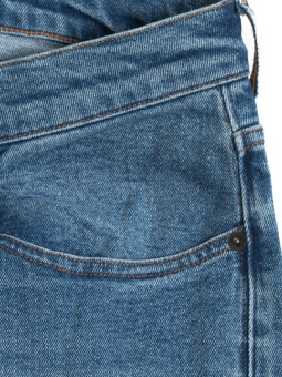 Jean, 5 poches, fil de piquage couleur tabac (traditionnel). Braguette à boutons. Double patte de boutonnage ceinture. Rivets de renfort aux angles de poches.