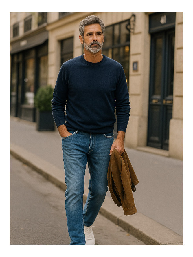 Ce jeans est confectionné dans un denim stretch bleu indigo, délavé avec subtilité pour obtenir un effet vintage recherché. L'approche écologique responsable dans le traitement du denim garantit un look authentique. Les coutures tabac ajoutent une touche traditionnelle tout en apportant du caractère au pantalon.